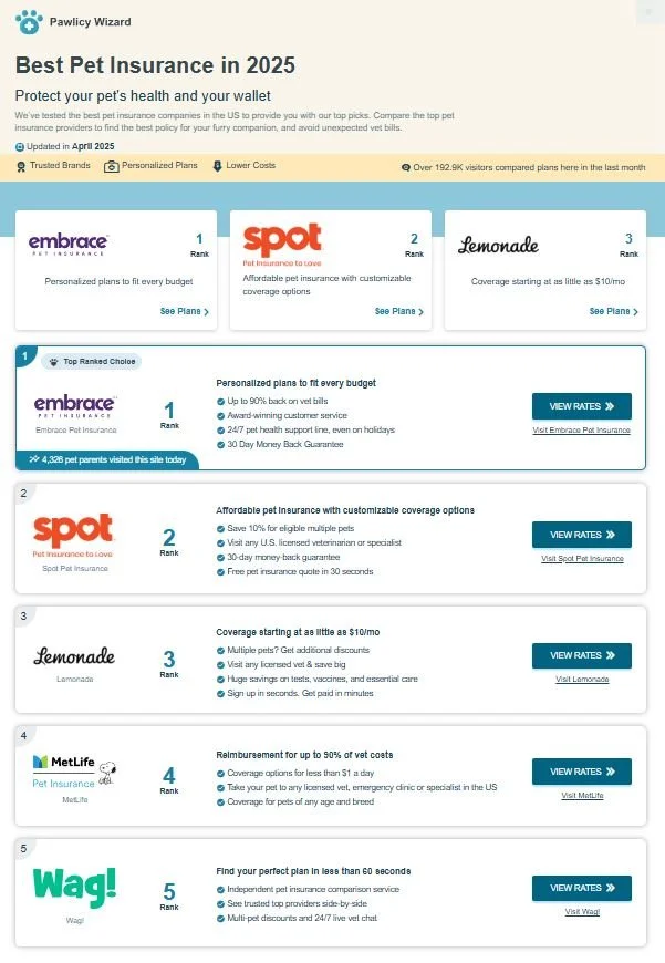Here is a screenshot of the Top 2025 Pet Insurance Options.